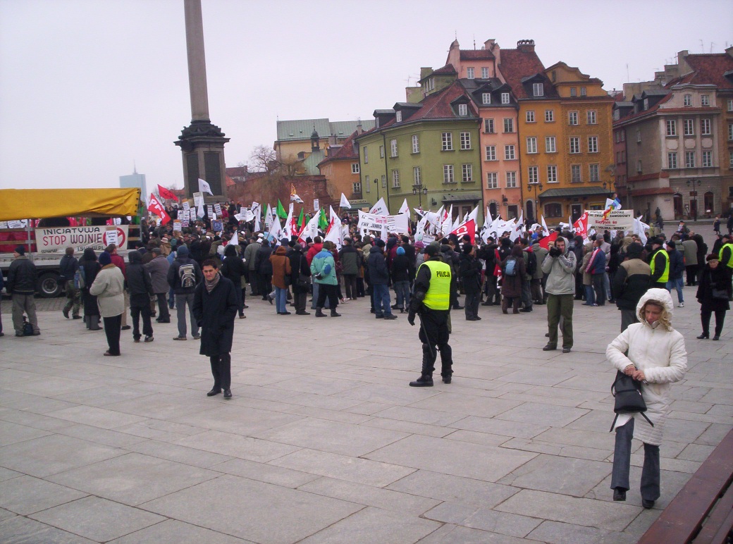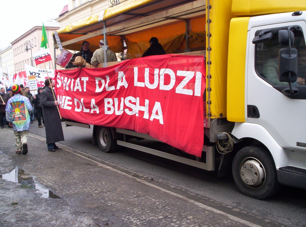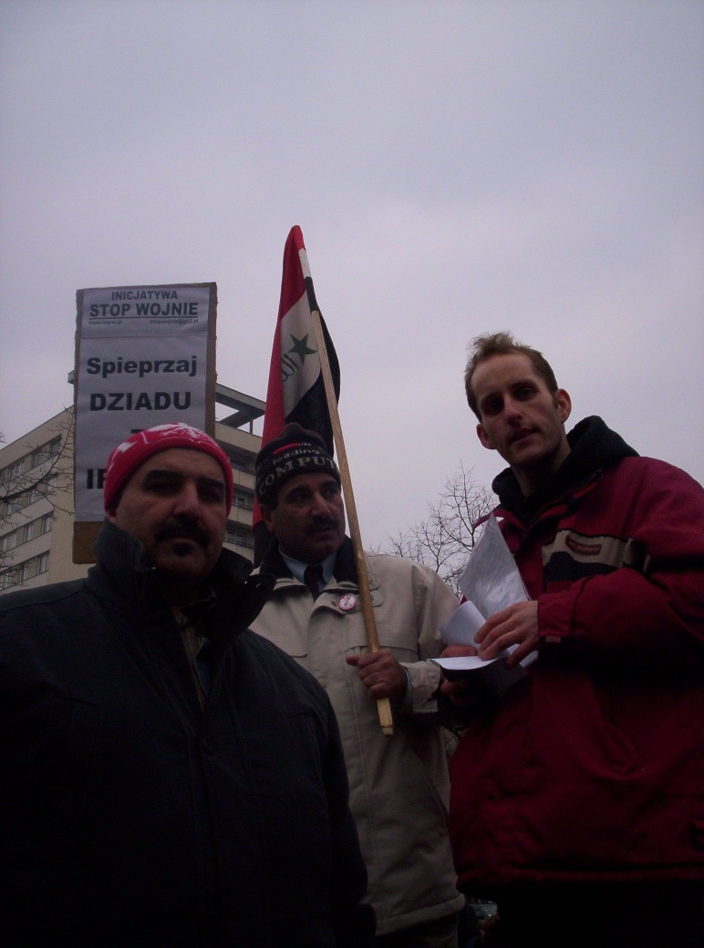 In Warsaw all the major anti-war demonstrations have been organized by Inicjatywa Stop Wojnie (Stop the War Initiative http://www.irak.pl ), where many people from Pracownicza Demokracja are involved (Worker's Democracy http://www.isw.republika.pl/). Pracownicza Demokracja is, according to wikipedia, a group of non-orthodox Trotskyists who are a part of the International Socialist Tendency (http://en.wikipedia.org/wiki/International_Socialist_Te...dency). In general the Anti-War movement is quite weak in Poland, taking into consideration that Warsaw was only able to muster between 3,000 (mainstream media estimates) and 10,000 (ISW figures) to march on Feb. 15th '03 when Dublin had c. 100,000 on the streets. In other cities such as Poznan, Lodz, Wroclaw and Bydgoscz small anti-war demonstrations have been organized by various groups including micro-siblings of the ISW and anarchist groups. There has been little or no significant direct action nor active mass opposition to put the gvt. under sufficient threat to withdraw troops, unlike Italy and Spain.
