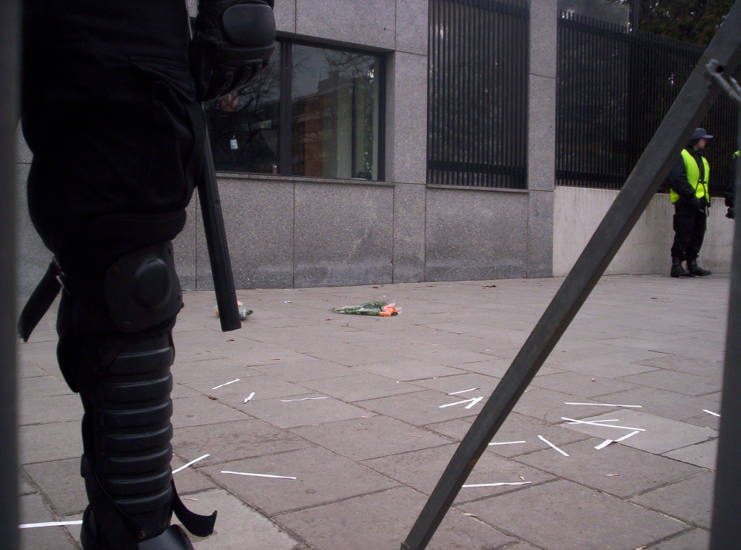 The US embassy was well protected by heavily clad cops and barricades so our plan to attach the names of war victims and roses to the railings was derailed. I was invited to speak on the platform about how we disarmed a US Navy plane in '03. Dorota translated and the rap seemd to go down well. It was a good opportunity to speak about the ploughshares tradition and invite those present to consider beating 'swords into ploughshares' in their own country, whether it be the 48 U.S. F-16's due for delivery here from November '06 or the proposed U.S. anti-ballistic missile 'Son of Star Wars' system the Pentagon want constructed in the Carpathian mountains in Southern Poland, which is soon up for debate in parliament. There was a lot of interest in the anti-war prisoner solidarity leaflets after we asked folks to send messages to those behind bars. We decided it would be best to give the four Iraqi men present the 20 roses and names of the victims to leave at the embassy. The cops wouldn't allow them through to construct a shrne so they flung the names and roses towards the embassy. The landed a short distance from the frowns of the behind-screen embassy staff. One of the Iraqi men is a journalist with Al-Iraqi news. All have been living in Poland for some time.