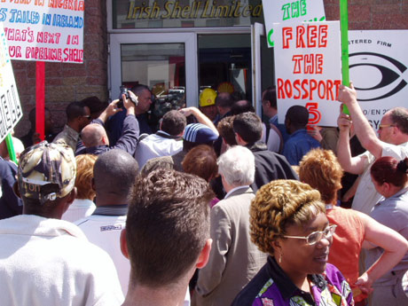 Outraged by yesterday's obscene jailing of the Rossport Five, Galway activists, their number greatly augmented by the Congolese and African community, picketed the dockland oil depot/offices of Shell Oil today.