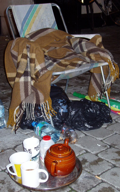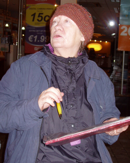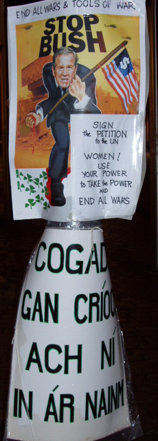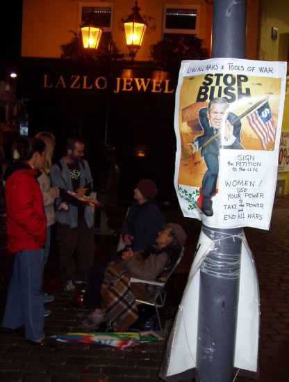 All photos were shot during the last hour of the fast On Tuesday August 15th, from midday to midnight, in the midst of intermittent deluges of rain, a group of women, including writers, poets, & artists, took part in a vigil/fast beside the statue-group of Oscar Wilde and his Estonian namesake, at the top of Galway's Shop Street. We surrounded ourselves with placards saying, "Stop Bush! Women, use your power to take the power and End All Wars -- sign the Petition!" Also -- "Men sign! to show solidarity with women." The petition itself read --