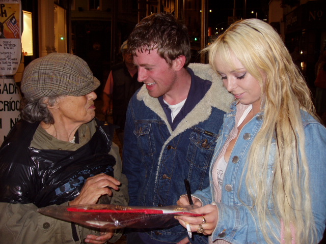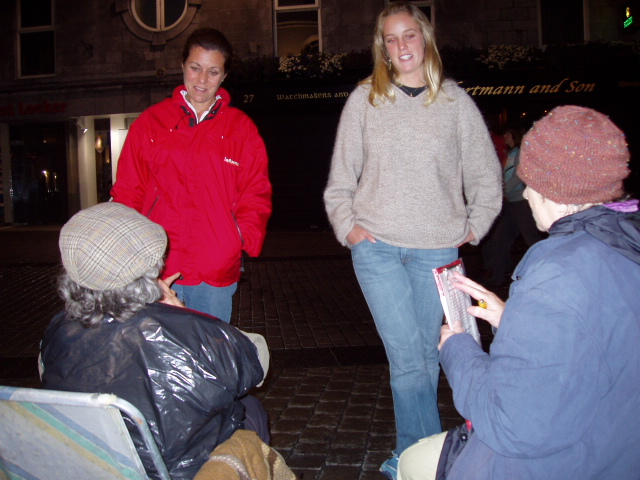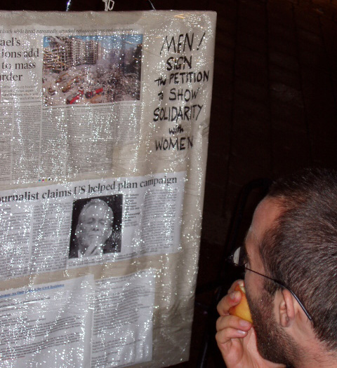 The response was amazing, and perhaps for the first time ever, Oscar Wilde was upstaged. It truly was a UN list of signatures -- holiday visitors from Japan, Korea, Belgium, France, Poland, Slovakia -- and (predominantly) the US. Some of the Americans were extremely emotional and said, "This is what we should be doing back home." There was much debate about the "silence of women" and the current cop-out whereby women seem so often to be inhibited from even using the word "woman" because everything nowadays has to be genderless. We were surprised by the number of young men who said, "yes it is time women took over." The only hostility we met came from a Northern Irish man who shouted "Up Israel! Smash Hizbollah!" On previous similar occasions we had found a vocally hostile reaction from Israeli tourists, and we were warned this week that there were a lot of Israelis in town. One such group of (religious orthodox) came and read the info -- which included a Lara Marlowe article from the IT about Israeli atrocities -- they made no comment and gave us no hassle -- it could have been because we had no men in our group ... The whole experience opened our eyes to greater possibilities -- while marches and rallies are very good for mobilizing support, a small informal group of women with home-made placards, no political affiliation and no shouting, can reap a positive response from what may seem to be a stereotypical conservative public. We just wish that more groups of women, relaxed and friendly and conversational, would try the same thing as ourselves, and do it on different days (not just Saturday afternoon) in many different places.
