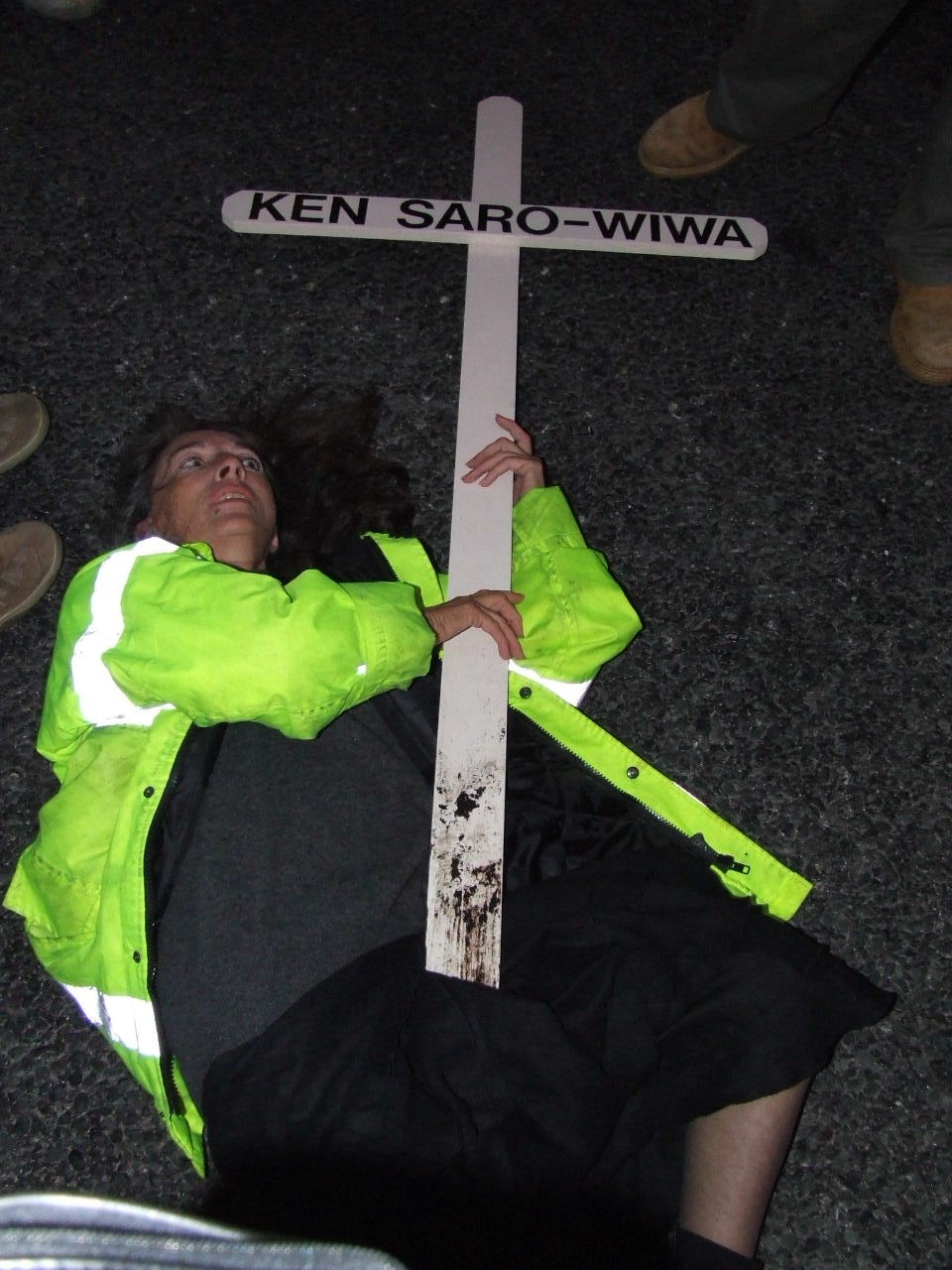 I've watched the clip of the so-called assualt on Maura Harrington repeatedly and I simply cannot see (or should that read sea) the guard in question pushing her - in fact it looks to me like she was pretending. I may however be wrong. Furthermore those crosses bearing the names of the Ogoni Nine do look very threatening when wielded in such an aggressive manner.