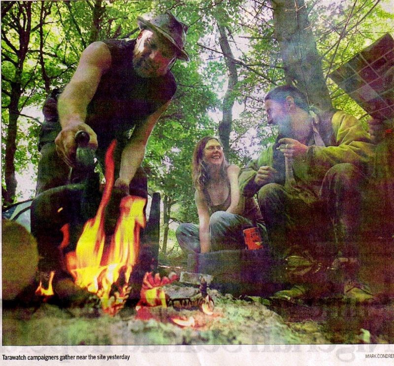 The recent discovery of an ancient wood henge at Lismullen, along with the remains of a large dog, which have now been removed, has given greater strength to the Tara campaign. Close by this site, protestors remain camped out in the woods on ‘construction watch’. Every morning at 6am they attempt to prevent construction continuing.