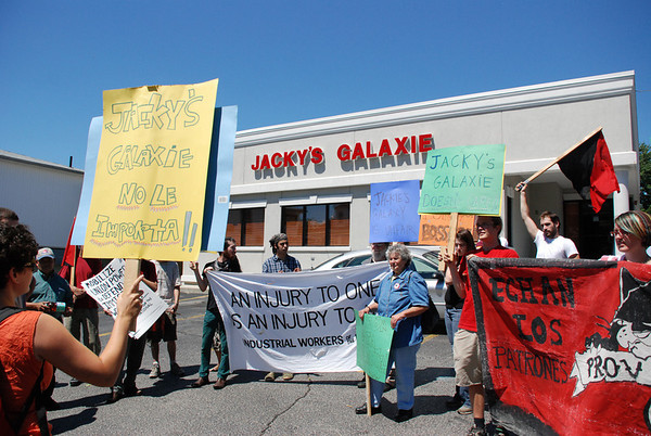 Over thirty members of the union along with supporters were marching to ‘Jackie’s Galaxy’, a restaurant chain supplied by New-York based company HWH, which is alleged to use slave labour conditions including 110 hour weeks.