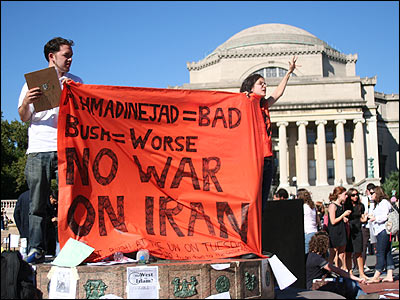The interruption provoked a furious melee in which punches were thrown and a shoe was hurled at the bemused president. Ahmadinejad was forced to cut his speech short and as he hurriedly left the campus, a member of his security detail fired a stun grenade to disperse angry activists attempting to follow him.