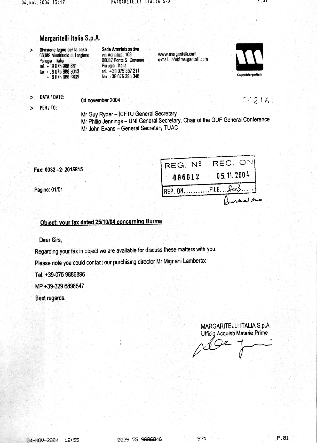 this is reply from one Italian company asked about Burmese involvement in 2004