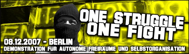 Because not everyone can come to Berlin to fight with us on the streets, we ask that the resistance spreads beyond this city, just as the fight for free spaces - as well as for our lives and freedom – is not a struggle isolated to Germany. There is no local anymore: there is only one struggle everywhere. In April 2008, there will be a a weekend of decentralized actions in defence of free spaces and against capital. We call for those actions to start now: on and around the 8th of December, we ask everyone to make an attack on those responsible for the brutal closure of the spaces we create for ourselves - to live, socialise, organise and attack from. The targets are countless.