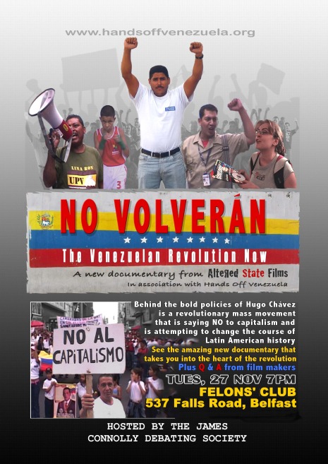 The James Connolly Debating Society is pleased to host a showing of 'No Volverán - The Venezuelan Revolution Now', an exciting feature length documentary about the Venezuelan Revolution.