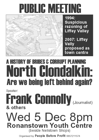 People before Profit Clondalkin is delighted that Frank Connolly at our public meeting in Neilstown. The community of Neilstown has been the real victim's of the dirty dealings of that is now been played out at the Mahon Tribunal. All are very welcome.