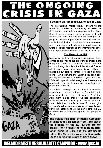 Why: In a nutshell, the 13th is the day the EU are signing into effect the 'Lisbon Reform Treaty'. The IPSC is using this opportunity to highlight the EU's role (via the International Quartet) in imposing an aid embargo on Gaza, as well as the general eclipsing of the Gazan crisis by the frenzy surrounding the Annapolis conference. A fuller explanation follows below...