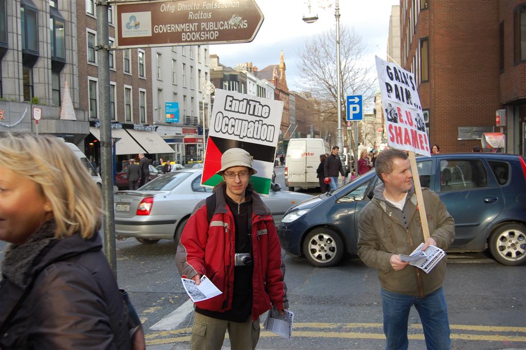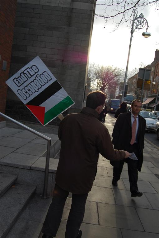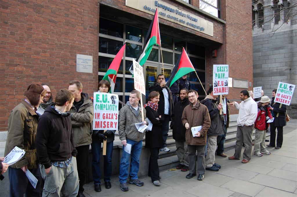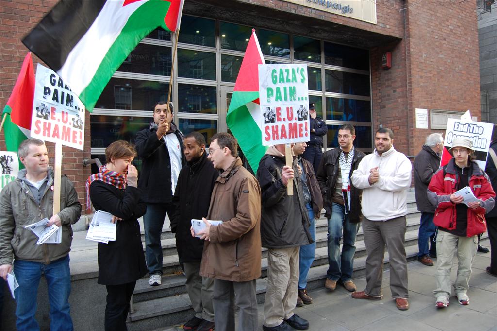 Over 20 IPSC activists spent their lunchbreak protesting at the EU offices on Thursday 13th December, protesting against the ongoing siege of Gaza. The EU closed their offices in response. After an hour of maintaining the protest, an EU official met with the IPSC secretary who handed over a letter of protest. 500 leaflets were handed out to members of the general public who passed by the offices.