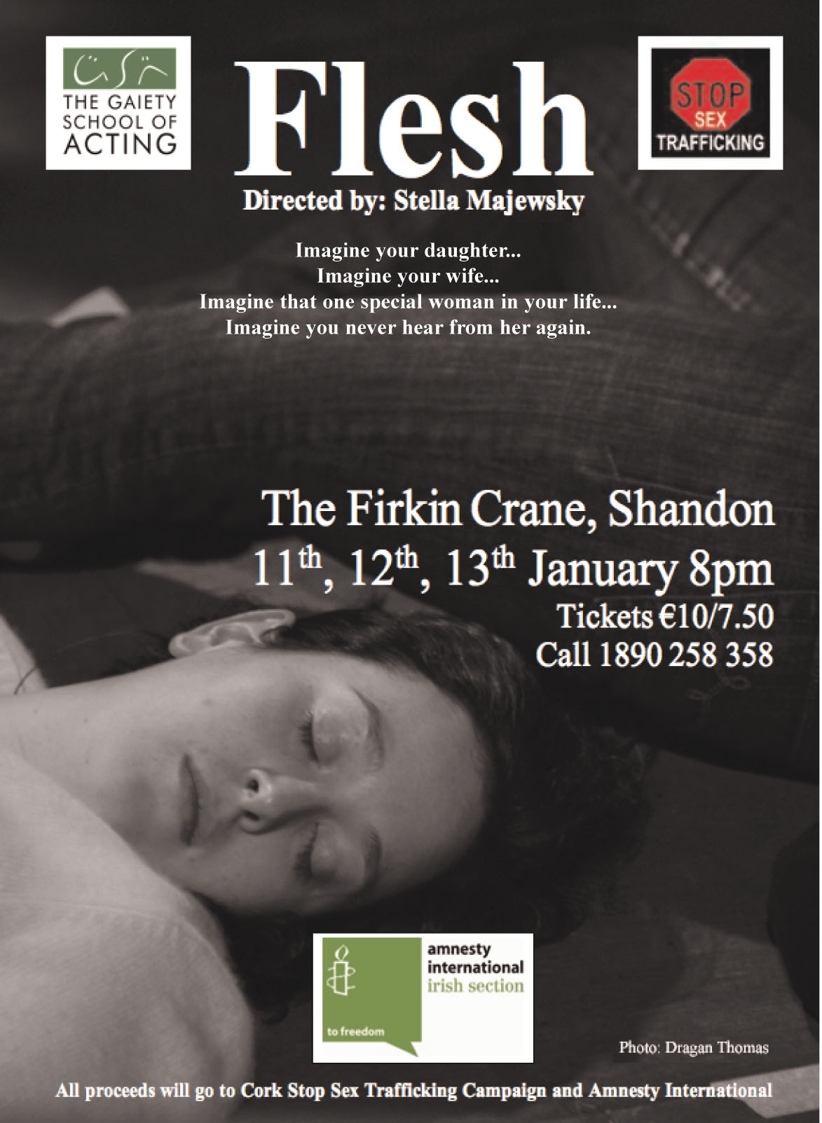 Flesh is a disturbing new play directed by Stella Majewsky that exposes the human cost of sex trafficking and explores the experiences of both victims and abusers. The Cork Gaiety School of Acting Adult Theatre Company, in co-operation with Amnesty International and the Campaign Against Sex Trafficking, is staging the play at the Firkin Crane, Shandon, Cork on 11, 12 and 13 January. All performances start at 8pm.