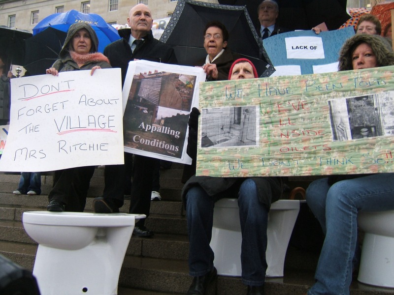 The Village residents were joined by others from East as well as West Belfast, and by Alex Maskey of Sinn Féin who has visited the area on a number of occasions to see the conditions for himself. In a statement he said, "The conditions in which people in the village area are living, is an absolute disgrace. To learn that elderly people are living in accommodation with no heating, no bathroom facilities, no inside toilet and no upstairs electricity is alarming.