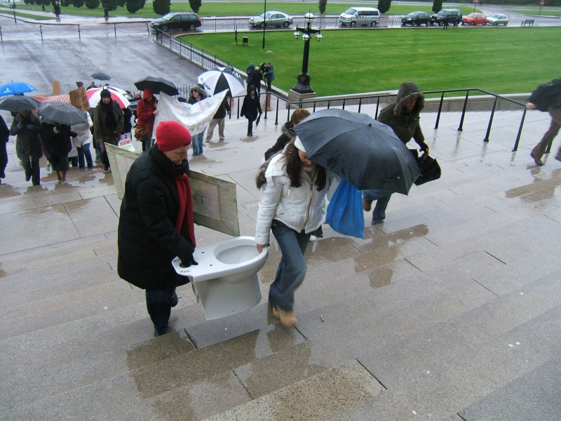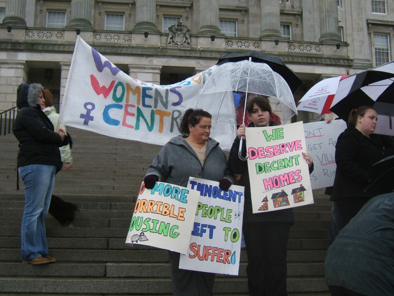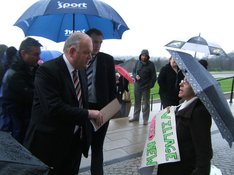 As the Assembly sat discussing the draft budget for the administration, the protestors stood outside in the rain demanding to see the First Minister Ian Paisley or DSD Minister Margaret Ritchie, declaring that they would no longer be ignored by the Executive on this issue.