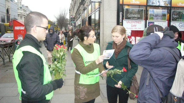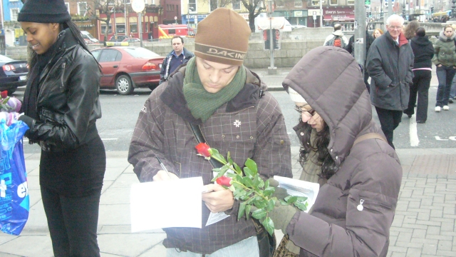 Amnesty International Irish Section activists distributed Valentine’s roses to Dubliners at O’Connell Bridge today in solidarity with human rights campaigners in Zimbabwe. It follows incidents in Zimbabwe’s capital, Harare, yesterday where police attacked members of Women of Zimbabwe Arise (WOZA) who were taking part in their annual Valentine’s protest where roses are handed out to the general public and the police.