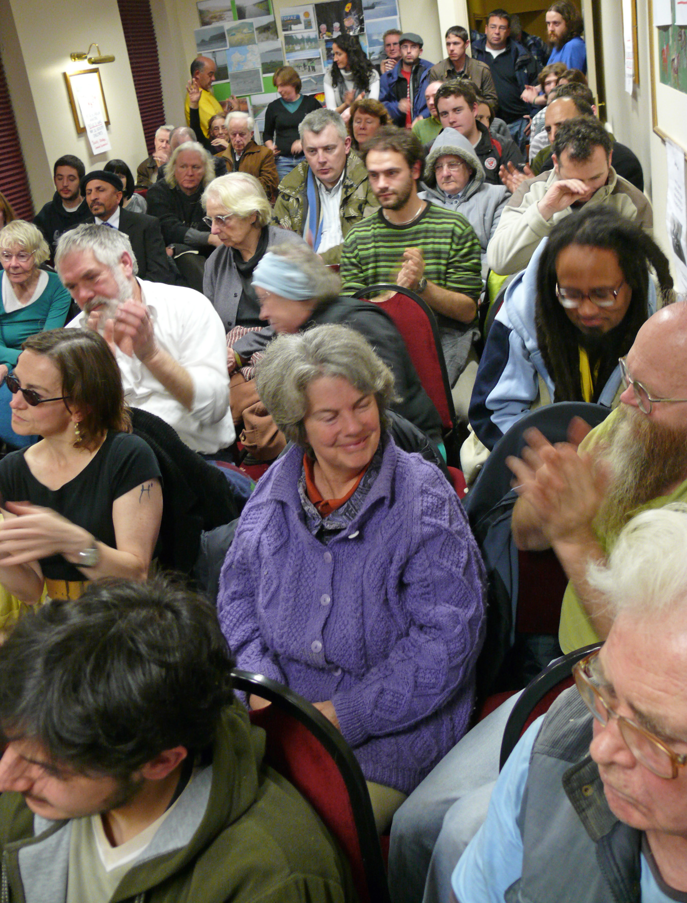 the Gardaí realised that every time they arrested him his sons and his brothers would immediately take his place, they reluctantly backed away; and so did the “Solitaire.” Maura Harrington, spokesperson for Shell to Sea, laid out the story of Shell’s prolonged violations of the life of Erris; she appealed to the many young people in the audience to take example of those in America who shouted out “Change! Yes we can!” Galway Shell to Sea put a proposal to the meeting, that a renewed campaign should start out with a nationwide petition (see wording below). This was unanimously accepted. Michael McCaughan in the chair gently guided the momentum of the meeting so that in the end we felt that real change was truly possible. Terence Conway, also a Glenaboy spokesperson for Shell to Sea, gave away videos of the Rossport struggle – “Take one, talk about it, pass it on! Watching a video, you can learn more than at a thousand meetings.” Galway Shell to Sea is now truly awake and up and running, as we appeal for other groups to follow through with this campaign and the petition.